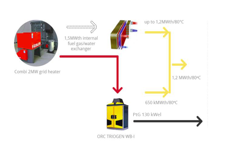 - the boiler is connected to the heat management, where there are a flue gas/water exchanger and an ORC system for generating electricity and hot water.